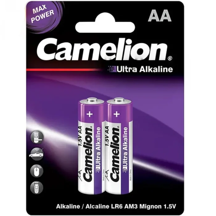 باتری قلمی آلکالاین کملیون با ماندگاری بالا، مناسب دستگاههای پرمصرف و فاقد مواد مضر مثل جیوه و کادمیم. بسته دو عددی، سایز AA و ولتاژ ۱.۵ ولت